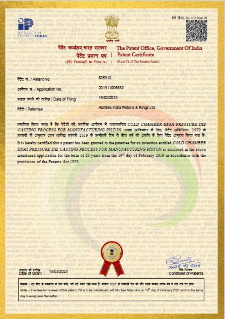 Ourcompany received its second patent (PATENT #525912 dated 14th March 2024) for Cold Chamber High Pressure Die Casting Process for Piston Manufacturing.